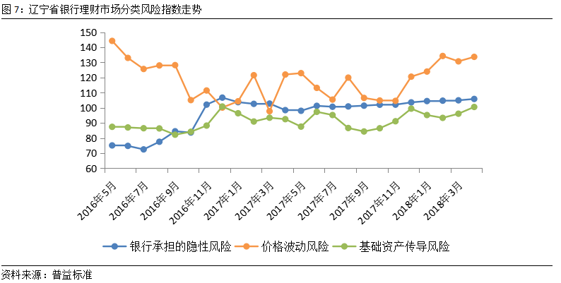 从风险指数看,4月辽宁省银行理财市场风险指数小幅上涨,环比上涨1.24点至107.85点,各类风险均表现出不同程度的上涨走势。从具体变化值来看,银行承担的隐性风险持续上行表现未发生改变,且涨幅在4月有一定比例的放大;基础资产传导风险在债券市场违约频发的大环境中,继续上涨,预计随着资管新规落地,短期内该风险继续上涨的概率偏大;全国整体价格波动风险在流动性趋于宽松的环境中走低,但辽宁地区受部分银行理财产品兑付压力的影响,价格波动风险呈现出微幅上涨走势。