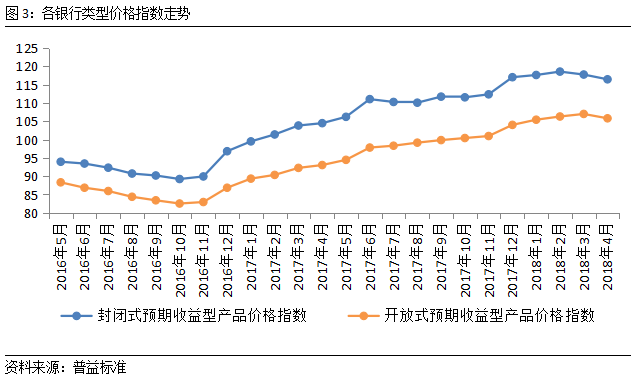 全国银行理财价格指数持续回落,不同开放类型产品价格指数走势趋同。2018年4月,全国银行理财价格指数继续下行,跌幅扩大,环比下跌1.26点至112.20点,其中封闭式预期收益型产品价格指数继续下跌,环比下跌1.30点至116.46点;开放式预期收益型产品价格指数结束连续17个月的上涨,本月出现回落,环比下跌1.19点至105.81点,开放式预期收益型产品与封闭式预期收益型产品走势趋于一致。