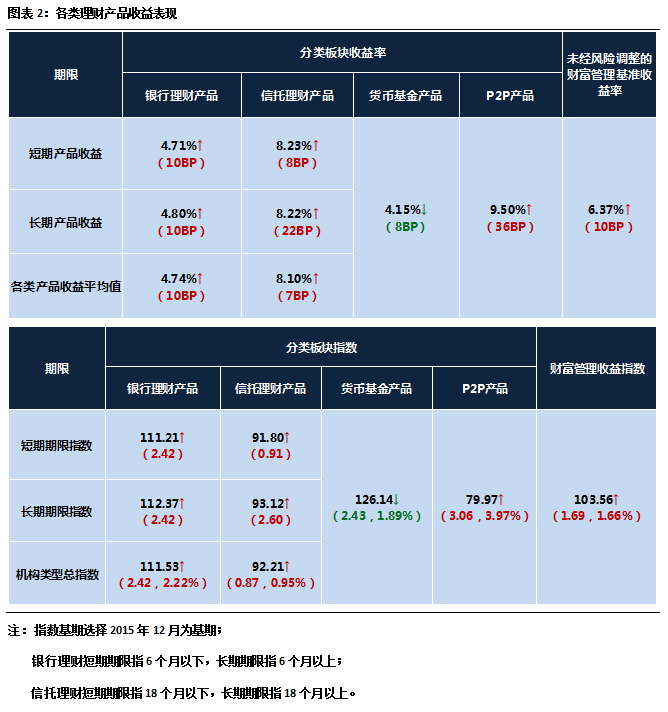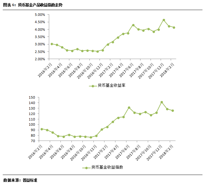 从收益指数分析,银行理财产品收益指数在2月有一定幅度的回升,环比上涨2.42点,至111.53点。具体来看,短期期限指数环比上涨2.42点,至111.21点;而长期期限指数也上涨2.42点,至112.37点。两类产品较为相似涨幅,凸显较为平稳的流动性环境。货币基金在2月继续表现出下行走势,环比下滑2.43点,至126.14点,下滑幅度明显收窄。在持续上涨利率的支撑下,货币基金产品收益指数下行空间将明显收窄。信托产品收益指数在本月继续维持上行态势,涨幅较1月有所收敛,环比上涨3.06点至79.97点。信托产品的上涨与近房地产信托的火热表现有较大关系,其它资金渠道受限促使房地产行业更加依赖信托作为资金源。P2P产品收益指数在1月小幅回落后,于2月重新上涨,环比上涨3.06点至79.97点,不过考虑到平台备案将近,未来P2P理财收益有较大下行可能。