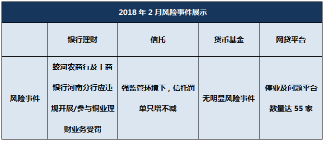 2018年2月,各级监管机构针对银行业务乱象密集开出大量罚单,其中针对银行理财业务的罚单主要集中于违规开展/参与同业理财业务。其中蛟河农商行30亿元违规向邮储银行购买或许根本不存在的同业理财产品,并套取理财资金开展票据业务。除了该风险事件蛟河农商行还在之前牵扯进了侨兴债事件,多起风险事件的爆发不仅伤害了蛟河农商行的声誉,接二连三的重罚也触及了银行的根本,资本充足率大幅下滑。无论是蛟河农商行涉及的违规票据案还是工商银行河南分行违规开展的同业理财业务,均显示部分银行或银行分支机构的内控较为松散,为违规行为留出了操作空间,未来银行应加大提升内控力度,避免违规事件频发。虽然货币基金在2018年2月无风险事件爆发,但监管自2017年末开始,连续下达多项指令严控货币基金规模扩张,以及近期对于流动性风险预防性部署,均体现出监管对于货币基金潜在风险的重视,在货币基金被逐步限制后,投资者有较大概率选择银行理财、存款类产品等替代品,促使货币基金规模下滑。在监管加大对于银行违规业务整治的同时,对于信托业务的惩罚力度只增不减,且从罚单范围来看,基本覆盖业务全流程。其中,华润深国投信托因向委托人披露信息存在重大遗漏,被罚款50万元,而光大兴陇信托更是由于集合信托贷款余额占公司所有集合信托实收余额比例接近监管红线,被甘肃银监局要求暂停贷款类集合业务。信托行业多维度风险事件频发凸显行业风险仍未出清,未来监管层大概率持续增强监管强度。2月P2P停业及问题平台数量为55家,较1月减少了15家。从当月问题平台的具体表现来看,其中41家平台停业,无跑路平台。考虑到网贷平台的备案要求,行业内不符合要求的P2P平台良性退出有利于行业发展,因此虽然P2P停业平台虽多,但良性退出的方式对于平台、投资者、行业都呈现积极影响。