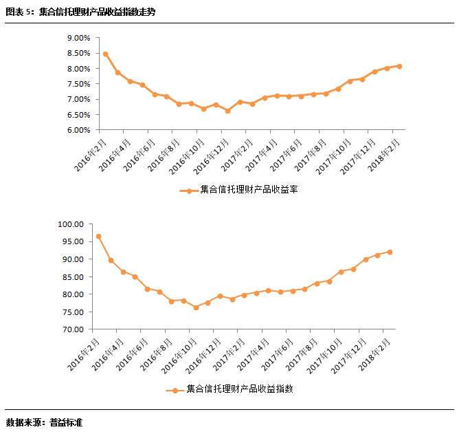 集合信托理财产品收益在2月有所收敛,但整体上行趋势并没有改变,环比上涨7BP至8.10%,在收益上涨的同时,集合信托理财产品收益指数环比上涨0.87点至92.21点。从收益走势来看,近期集合信托理财产品收益呈现明显的收敛趋势,上涨动力有所减弱,不过由于近期监管对于银信合作管控的持续收严,信托资金端压力明显增强,促使信托公司提升产品收益增强资金募集能力,因此近期信托理财产品收益大概率继续上行。