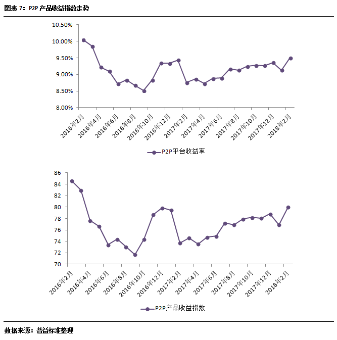 2018年2月,P2P产品收益环比上涨37BP至9.50%,收益指数环比上涨3.06点至79.98点。从当前P2P产品的变化趋势来看,整体借款期限呈现出较为明显的拉长表现,2月P2P网贷行业借款期限较1月环比拉长近2月。而流动性较差的产品通常收益率也更高,这边促使行业收益率呈现上涨趋势。另一方面,受2月春节影响,各家P2P平台也会通过提升收益等方式抢占流动资金,因此2月P2P平台整体手呈现了较为明显的上涨变化。
