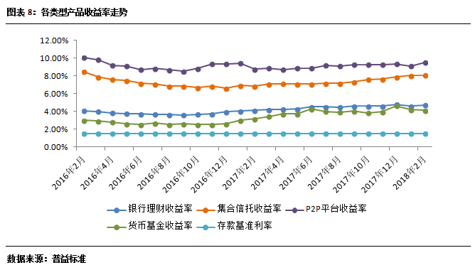 2018年2月,受春节假期影响,财富管理市场整体飘红。其中银行理财保持了较为平稳的走势,环比上涨10BP至4.74%;货币基金仍然表现出小幅下滑态势,环比下滑8BP至4.15%;信托理财产品继续呈现出收敛的上涨走势,环比上涨7BP至8.10%;P2P产品收益在2月迎来了较大涨幅,环比上升36BP至9.50%。