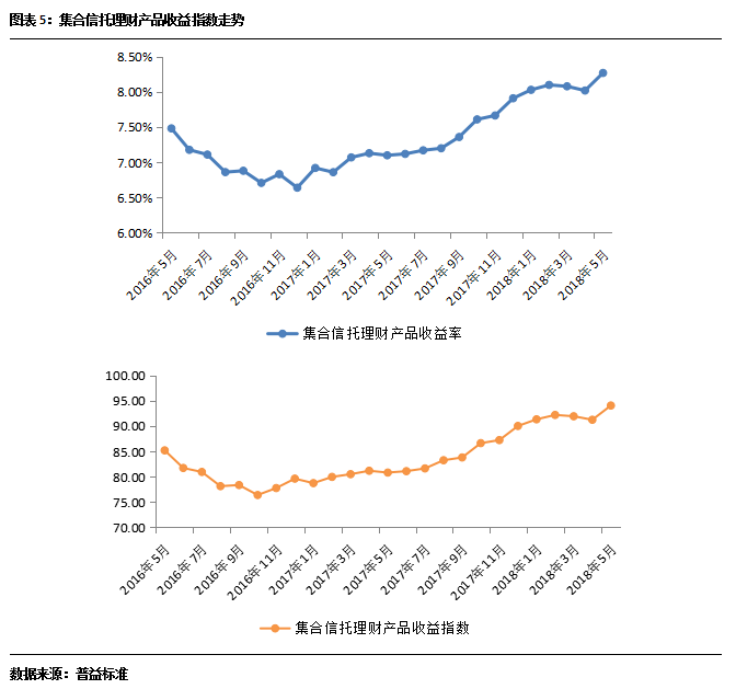 集合信托理财产品收益在5月明显回升,环比上涨25BP至8.27%。在收益上涨的同时,集合信托理财产品收益指数也出现回升,环比上涨2.82点至94.07点。这与信托公司业务转型渠道阶段性成果有较大关系,目前绝大多数信托公司的业务重心已从通道业务转向了主动化管理业务,不过值得注意的是近期收益走高的信托产品多为房地产信托产品,在房地产行业持续受限的情况下,此类项目的兑付压力仍然较大。另外,随着监管层对于信托融资渠道的规范,致使信托资金来源受到限制,而在融资需求不变的情况下,资金供给降低,必然促使融资成本上涨,带动信托产品收益上行。预计信托产品近期收益在房地产项目不出现大幅变动的情况下,将保持缓步上涨趋势。