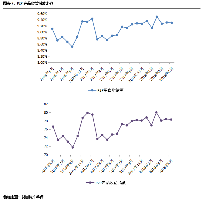 2018年5月,P2P产品收益环比上涨1BP至9.30%,收益指数相应下滑0.12点至78.29点。在备案制落地前夕,市场规模的扩张受到抑制,合规性调整仍然是行业当前的重要任务。具体来看,备案制的延期大幅拖慢了部分合规机构的发展步伐,造成此类机构成本相对更高,客户损失可能性更高的情况,如果监管层久拖不决,无疑对于合规机构的业务开展造成极大的冲击。当然对于部分仍处于调整中的机构,备案制的延期也给予了此类机构争取第一批通过备案的机会。从当前市场的表现来看,行业的合规性调整远未达到成熟的程度,机构跑路、违规等问题仍然时有发生,凸显出行业的规范性仍然不足。在行业整体规模受限,合规性调整仍在继续的环境中,P2P产品的收益缺乏支撑其上涨的动力,因此预计该类产品收益在备案制落地前整体呈现平稳下行的态势。