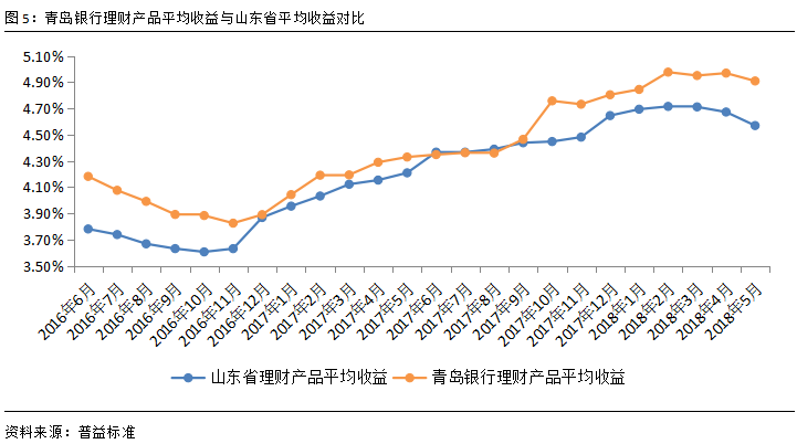 从理财产品收益来看,山东省银行理财产品收益整体下滑幅度较大,达10BP。而青岛银行收益表现相对较为稳定,仅下滑了6BP。加之青岛银行理财产品此前一直保持较高的收益水平,因此,本月收益的小幅下滑并未对青岛银行理财产品造成过大的影响,其平均收益仍然领先山东省大部分银行机构。