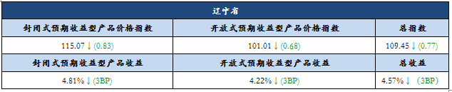 本月辽宁省封闭式非保本预期收益型产品收益环比下跌2BP至4.96%;相应价格指数环比下跌0.54点至118.66点。