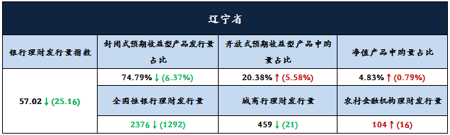 从发行指数来看,辽宁省银行理财发行指数环比下跌25.16点至57.02点,跌幅持续扩大,且跌幅远高于全国银行理财发行指数跌幅。