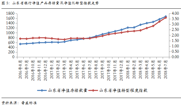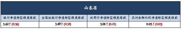 从净值转型程度指数来看,本月山东省净值转型程度稳步上升,但上升幅度较上月有所减弱。整体来看,山东省净值转型程度指数为3.62点,环比上涨0.36点,同比上升1.91点。分银行类型来看,山东省全国性银行净值转型程度指数为3.89点,环比上升0.34点,同比上升2.14点;城商行净值转型程度指数为3.28点,环比上升0.21点,同比上升1.10点;农村金融机构净值转型程度指数为0.03点,环比上升0.03点,同比上升0.03点。